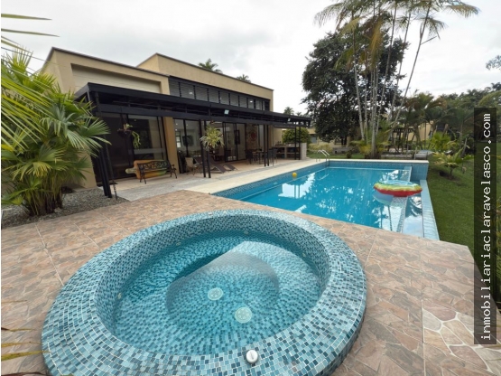 Se vende espectacular casa campestre de un solo nivel, en conjunto cerrado, la casa consta de: 3 habitaciones cada un acon su baño, sala comedor, cocina integral, zona de ropas, cuarto de empleada con baño, estudio, terraza exterior con zona de BBQ, piscina jacuzzi, excelente vista al guadual.
